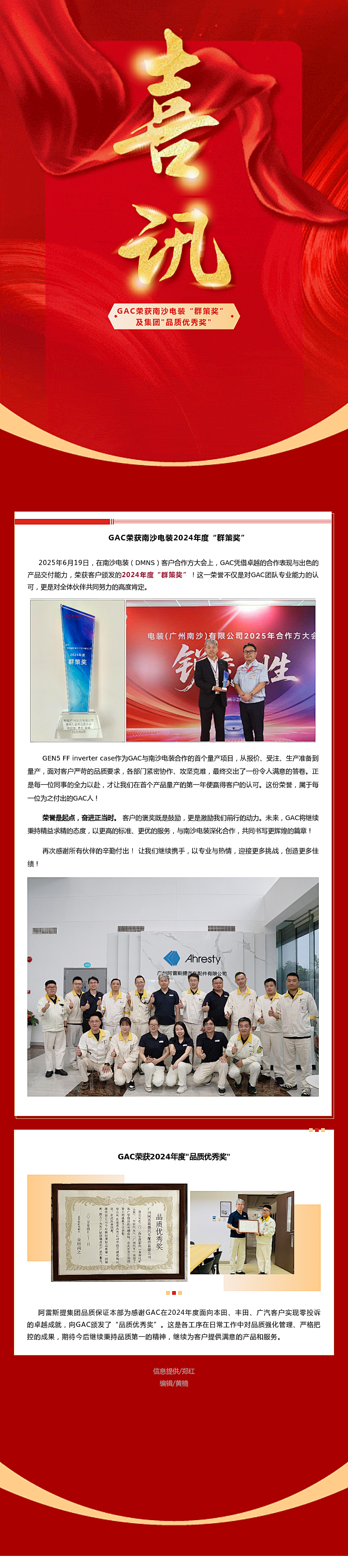 GAC榮獲南沙電裝2024年度“群策獎”及集團“品質優秀獎”